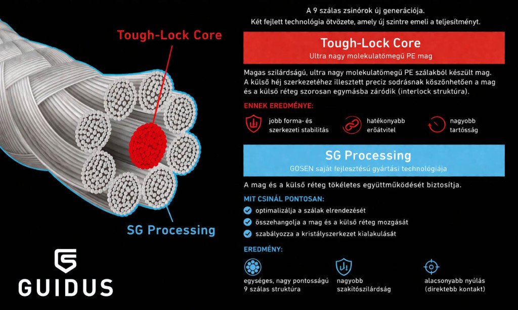 A Gosen Guidus a 9 szálas zsinórok új generációja a fejlett technológiák ötvözésével teljesen új szintre emeli a horgászat élményét. A Tough-Lock Core kialakítás egy ultra nagy molekulatömegű PE magra épül, amely kiemelkedő szilárdságot biztosít. A precízen kialakított sodrásnak köszönhetően a belső mag és a külső réteg szorosan egymásba záródik, így egy rendkívül stabil, tartós és megbízható szerkezet jön létre. Ennek eredményeként a zsinór nemcsak jobban megtartja formáját, hanem hatékonyabb erőátvitelt és hosszabb élettartamot is kínál.